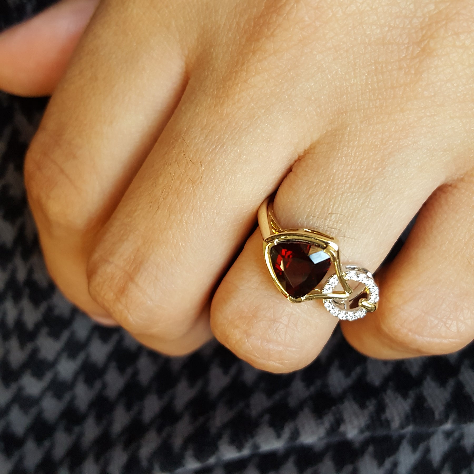 Like a secret spoken only to the heart, AGC#301 “Crimson Whisper” is a ring that carries both passion and elegance in every detail. Handcrafted in radiant 14k two-tone gold, its design balances strength and softness, creating a piece that feels both timeless and modern. At the center glows a striking 1.94ctw Arizona Garnet, its deep red hues reminiscent of fine wine, glowing embers, or the final moments of a breathtaking sunset. Every facet catches the light with quiet fire, giving the gem a voice that speaks in richness and warmth. Accentuating the garnet is a delicate circle of 0.06ctw diamond accents, sparkling gently like a constellation around a glowing star. The diamonds add just enough brilliance to frame the garnet’s intensity, enhancing the stone’s natural beauty without overshadowing its depth. Crimson Whisper is a treasure meant for those who embrace life’s passions; a jewel that doesn’t shout, but lingers softly, leaving a lasting impression that cannot be forgotten.