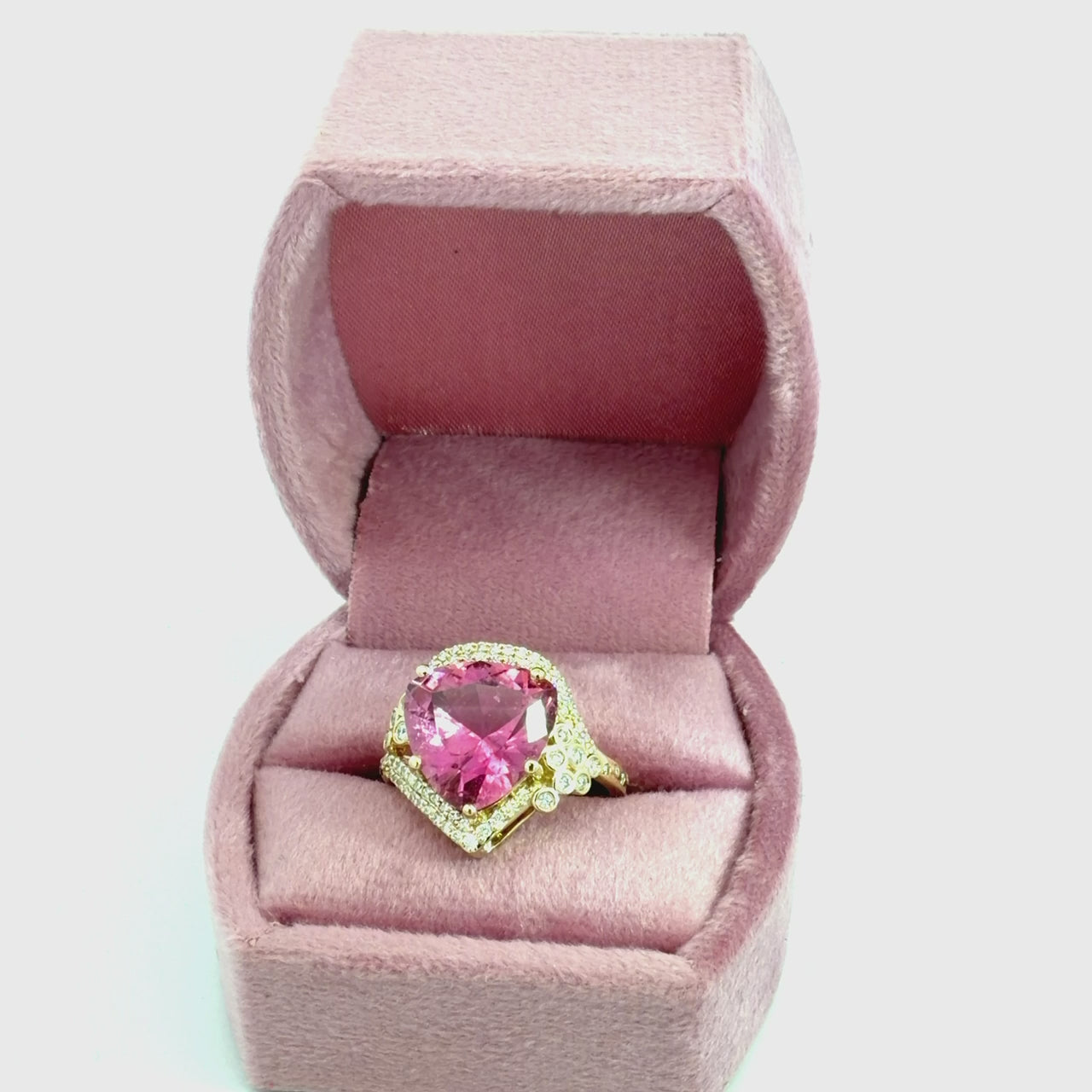 A ring designed to turn heads, AGC#297 “Popular” is a showcase of confidence, beauty, and effortless charm. Crafted in glowing 14k yellow gold, it centers around an exceptional 6.21ct California Pink Tourmaline—a gemstone bursting with vibrant, luminous color. Its rich pink tones shift with the light, moving from playful warmth to sultry depth, like a summer sunset fading into twilight. This stone doesn’t ask for attention; it owns it.