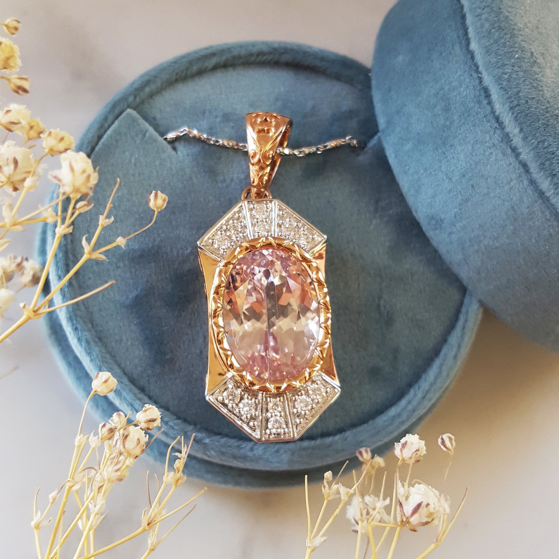 A pendant that feels like a masterpiece from another era, AGC#304 “Renaissance Rose” embodies elegance reborn. Every detail whispers of artistry and devotion, a piece that seems as though it could have been discovered in a royal collection yet shines with the brilliance of modern craftsmanship. Hand-forged in a luxurious blend of 14k white and rose gold, its design is both a nod to the grandeur of history and a celebration of contemporary refinement. At its center blossoms an extraordinary 16.18ct California Kunzite, a gemstone that seems to glow from within. Its delicate blush-pink tones, brushed with hints of lavender, unfold like the petals of a rose bathed in the light of dawn. As the pendant moves, the Kunzite reveals new depths of color and sparkle, its beauty alive with shifting light. Surrounding this remarkable gem, a halo of 0.39ct diamond accents glitters like a crown of stars, each stone adding brilliance and contrast while honoring the Kunzite as the radiant centerpiece. The intricate goldwork — blending warm rose gold with the cool brilliance of white — frames the gem with a sense of regality and romance, weaving together strength, grace, and history. Renaissance Rose is a jewel that feels alive — a luminous bloom captured in gold, holding within it both the softness of romance and the strength of legacy. It is not simply worn, but carried as a symbol of beauty that refuses to fade.