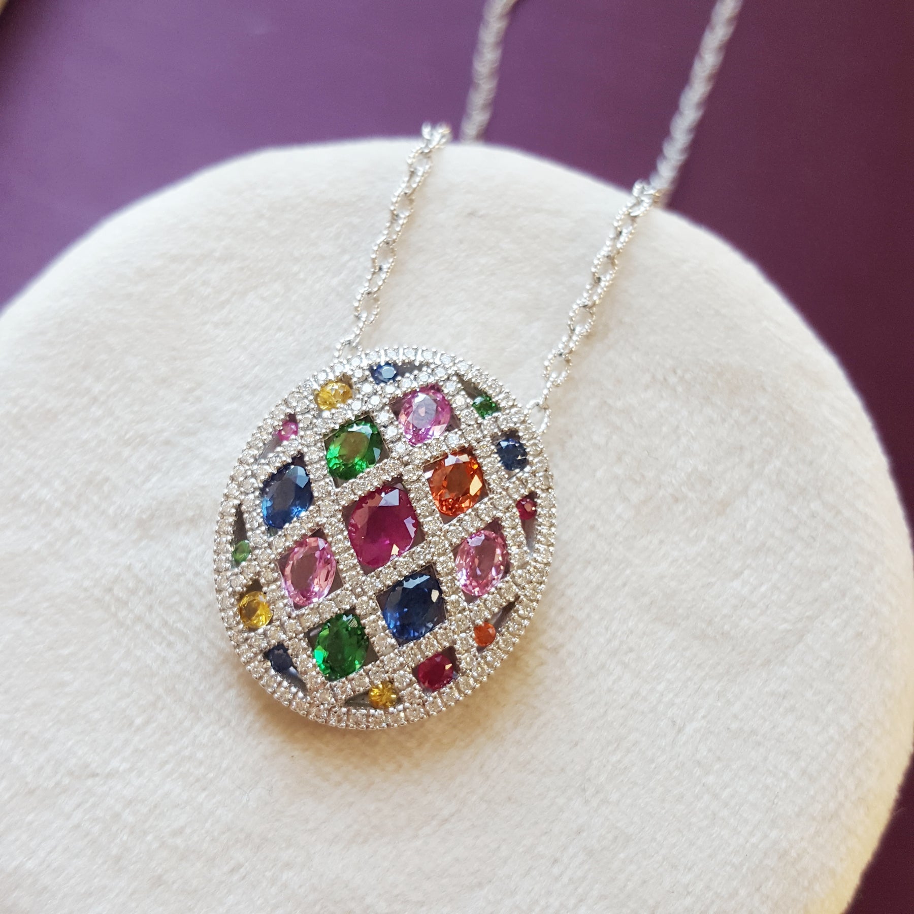 This 14K white gold pendant channels Fabergé elegance with an intricate lattice design. Featuring 2.45 carats of rubies, sapphires, tsavorite garnets, and diamonds, it's a radiant statement piece that demands attention. Includes an 18-inch chain and arrives ready to wear.