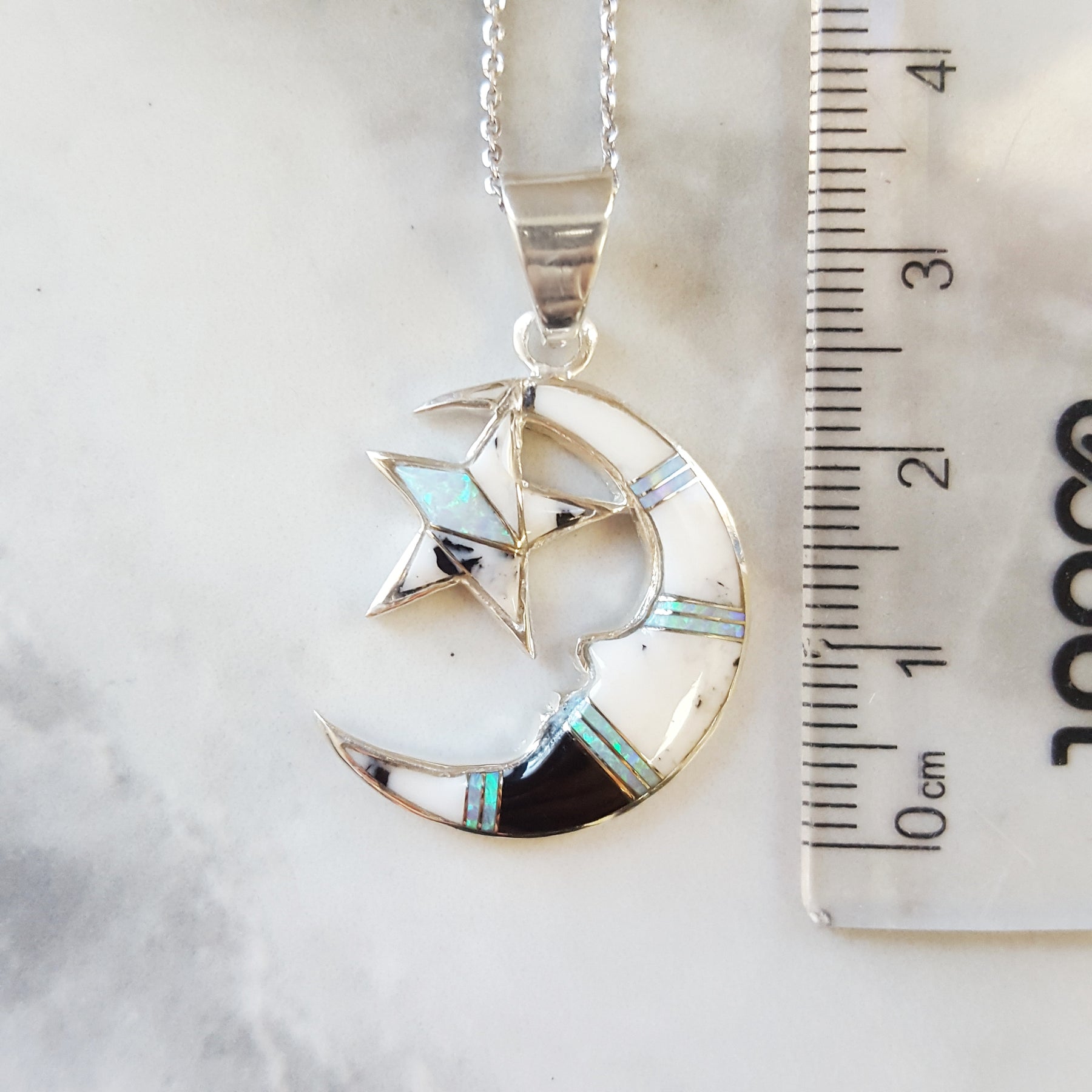 Reach for the night sky with this moon and star pendant. The celestial design is crafted in sterling silver and features dreams Nevada White Buffalo stone. To twinkle like the stars in the night sky, the pendant is accented with strips of metallic blue lab-grown opal. Just like the stars, this pendant is what dreams are made of.