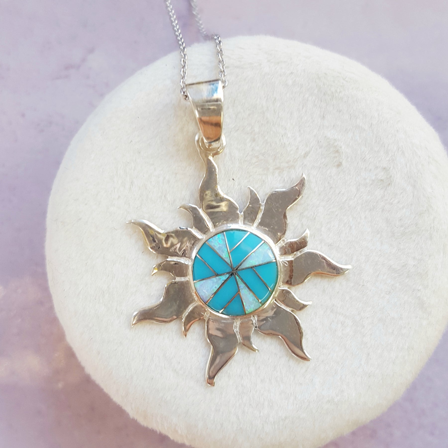 You are sure to shine when you wear this turquoise sun pendant. Handcrafted in sterling silver, the center of this sun features colorful stabilized Arizona Kingman Turquoise. Between the sections of these colorful stones are segments of lab-grown opal. When this incredible pendant catches the light, the colors stand out and the opal glistens. Be as bright as the sun when you wear this adorable piece.