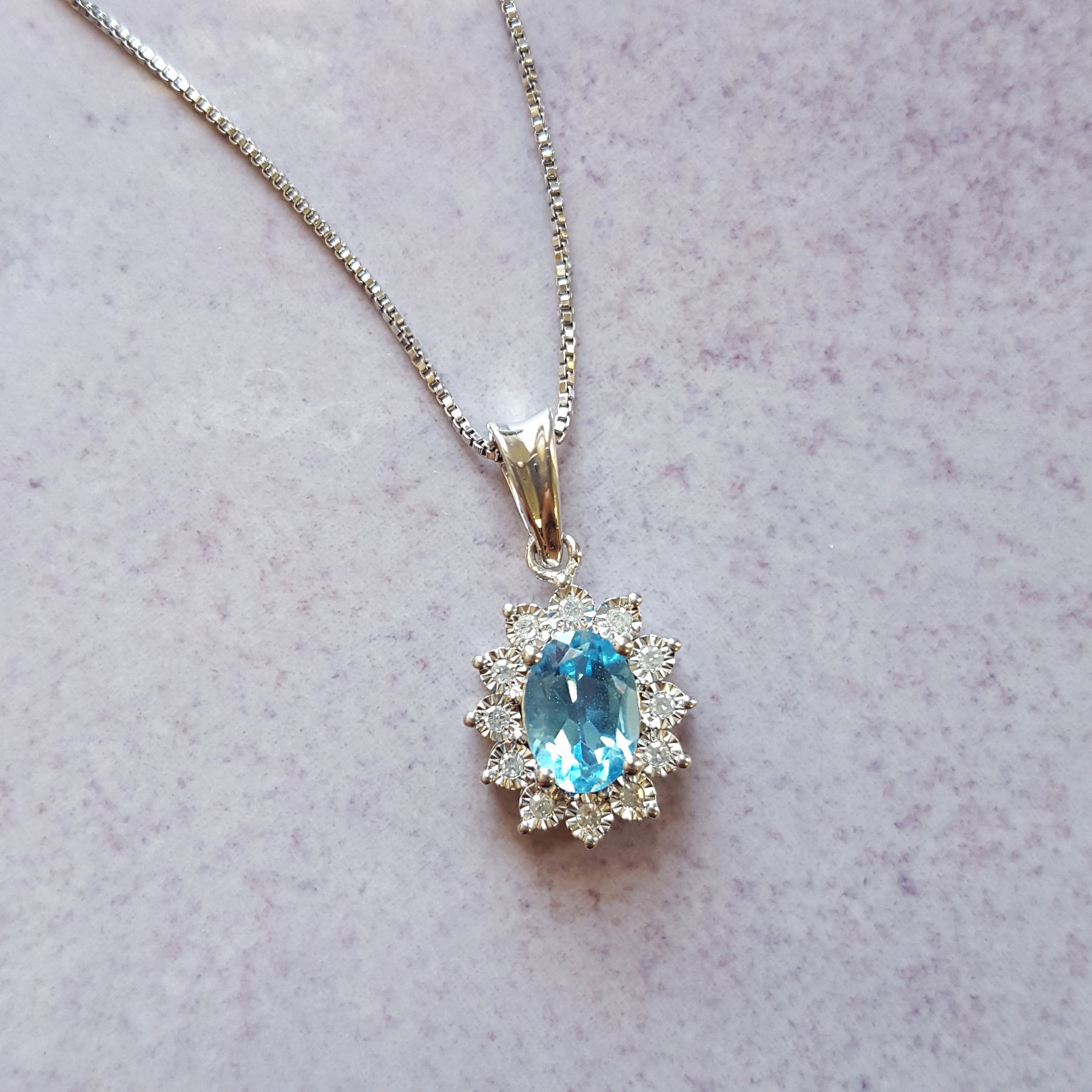 This sterling silver pendant features a 1-carat oval blue topaz, surrounded by a halo of 1/20 carats petite diamonds for added sparkle. Finished with an 18-inch chain, it combines timeless elegance with everyday style.