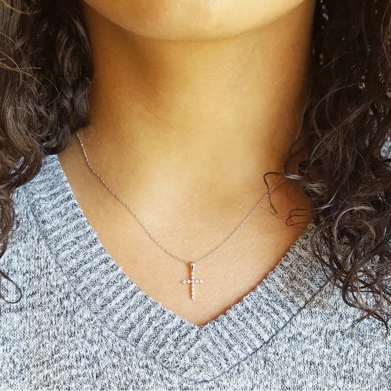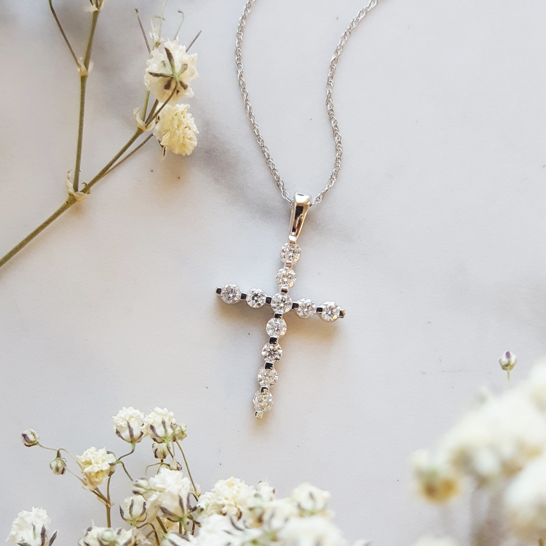 Honor your faith with this beautifully crafted 14k white gold diamond cross pendant. Featuring a graceful and timeless design, this meaningful piece is available in total diamond weights ranging from 1/10 to 1 carat, so you can choose the amount of brilliance that fits your personal style. Each round diamond is carefully set to enhance the cross’s elegant silhouette, while the sleek white gold setting offers a modern and polished finish. Whether you're gifting it to a loved one or wearing it as a symbol of your own beliefs, this pendant is a cherished piece that brings together faith, sparkle, and classic sophistication.