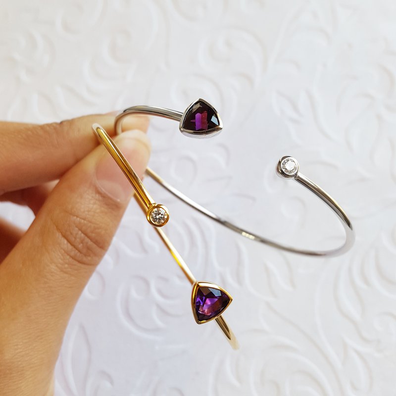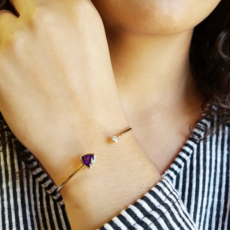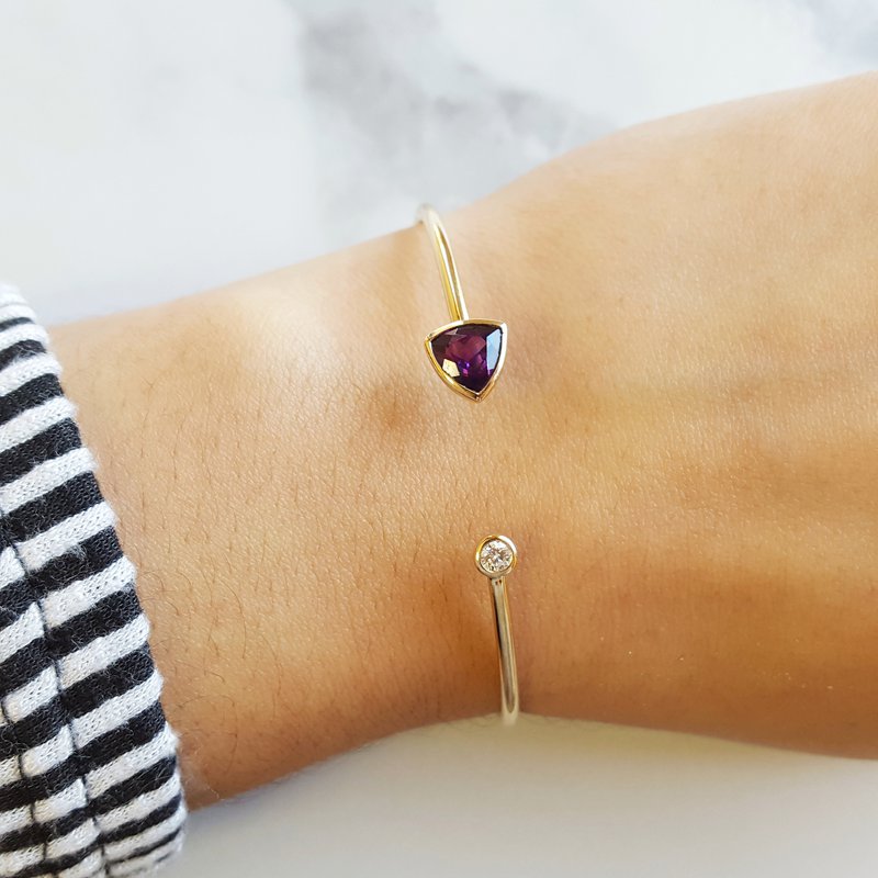 This bangle style bracelet is sleek and stylish! Crafted in warm 14k yellow gold, the design easily flexes open and closed, for an effortless fit on practically any wrist! It's adorned with a superior quality Arizona Amethyst, cut to a precise trillion shape, which measures7mm and weighs1 carat. Opposite the amethyst is a round diamond accent, weighing .12 carats.